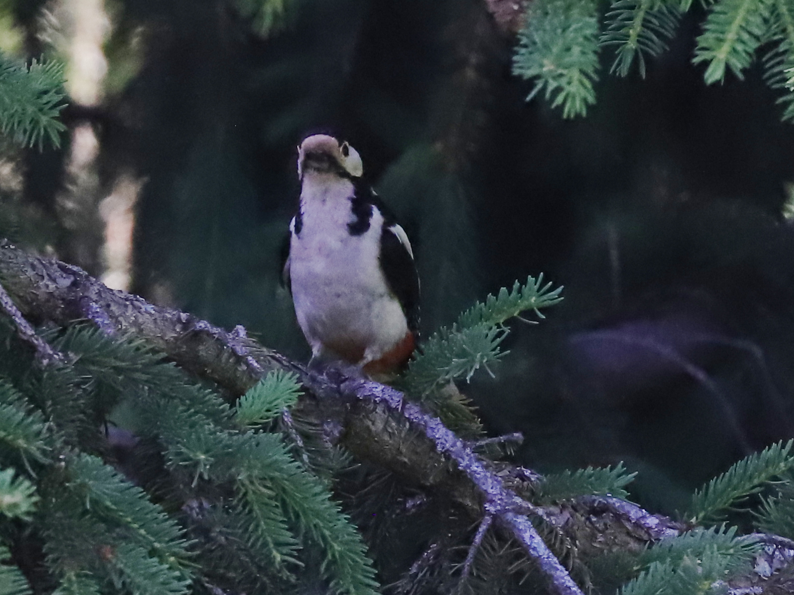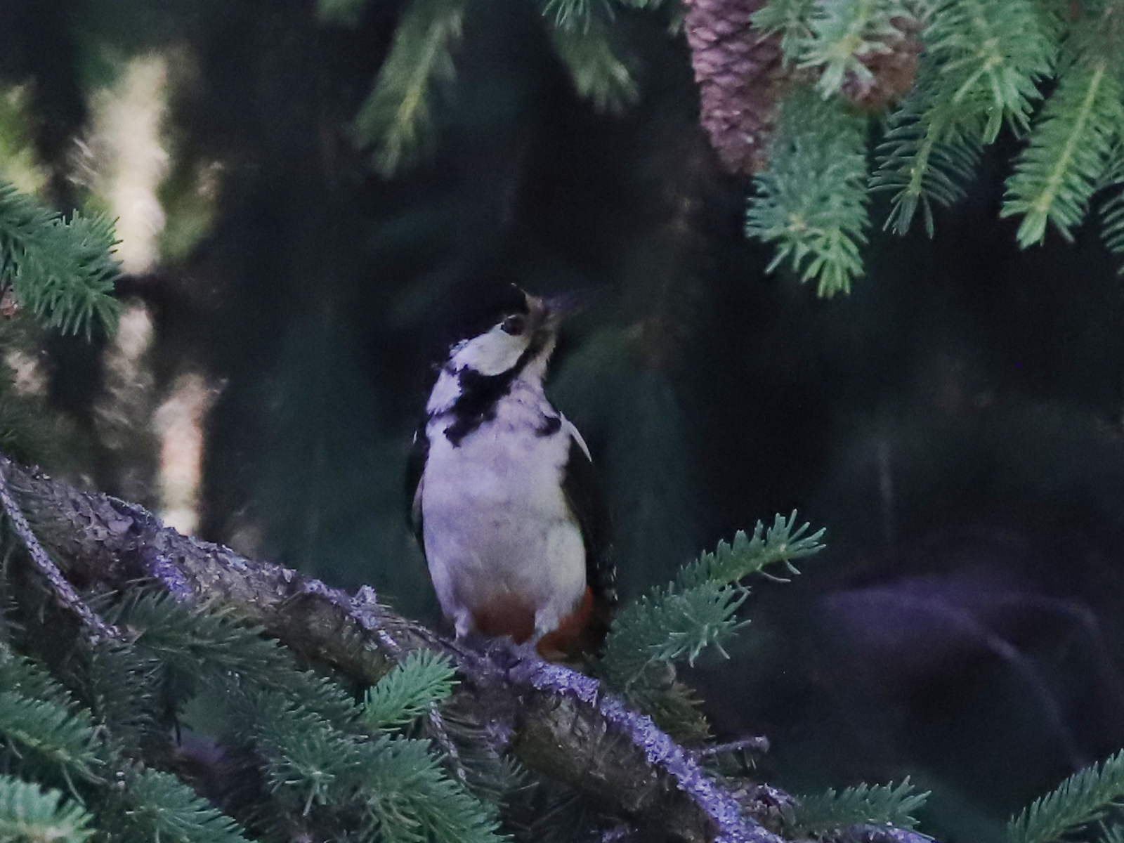 … deux Pics épeiche Dendrocopos major, dont un difficile à voir dans l’ombre d’un sapin …