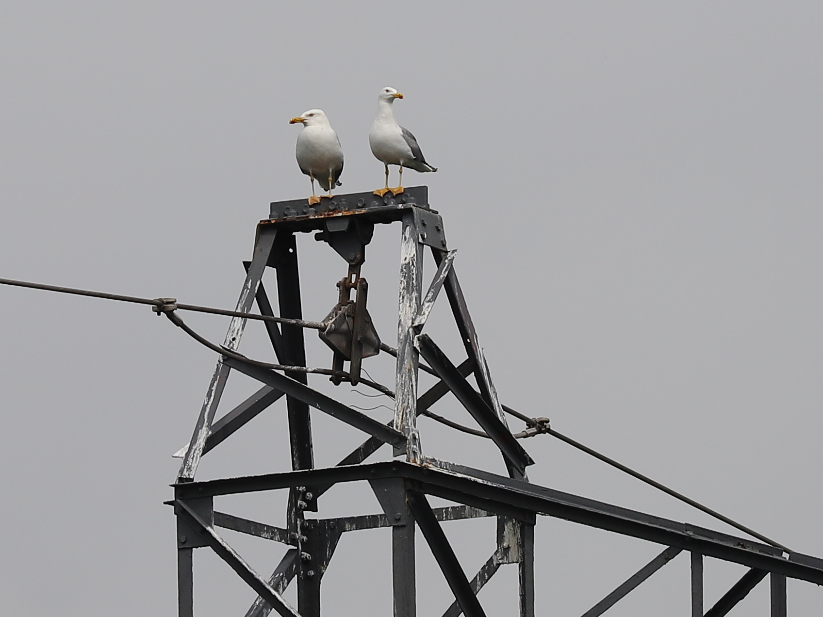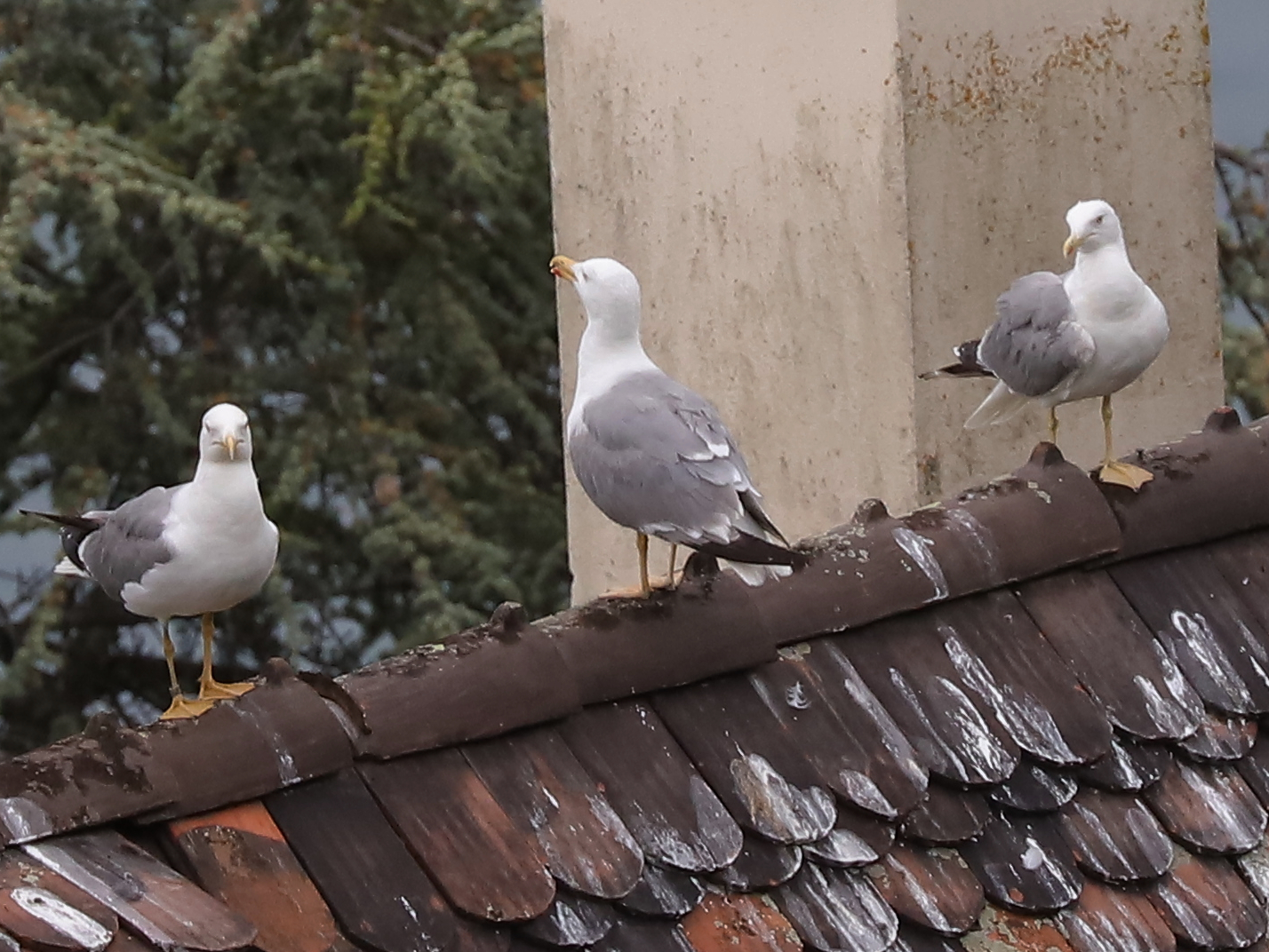 … et des Goélands leucophée Larus michahellis. Le dernier arrivant doit se faire une place, ceux déjà installés étant toujours réticents partager le perchoir.