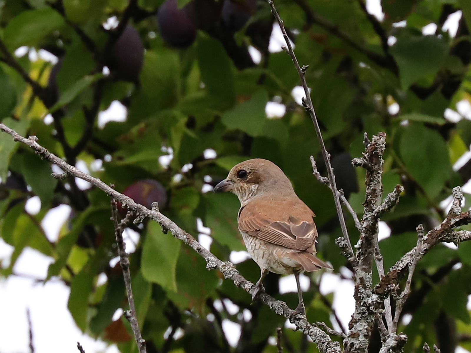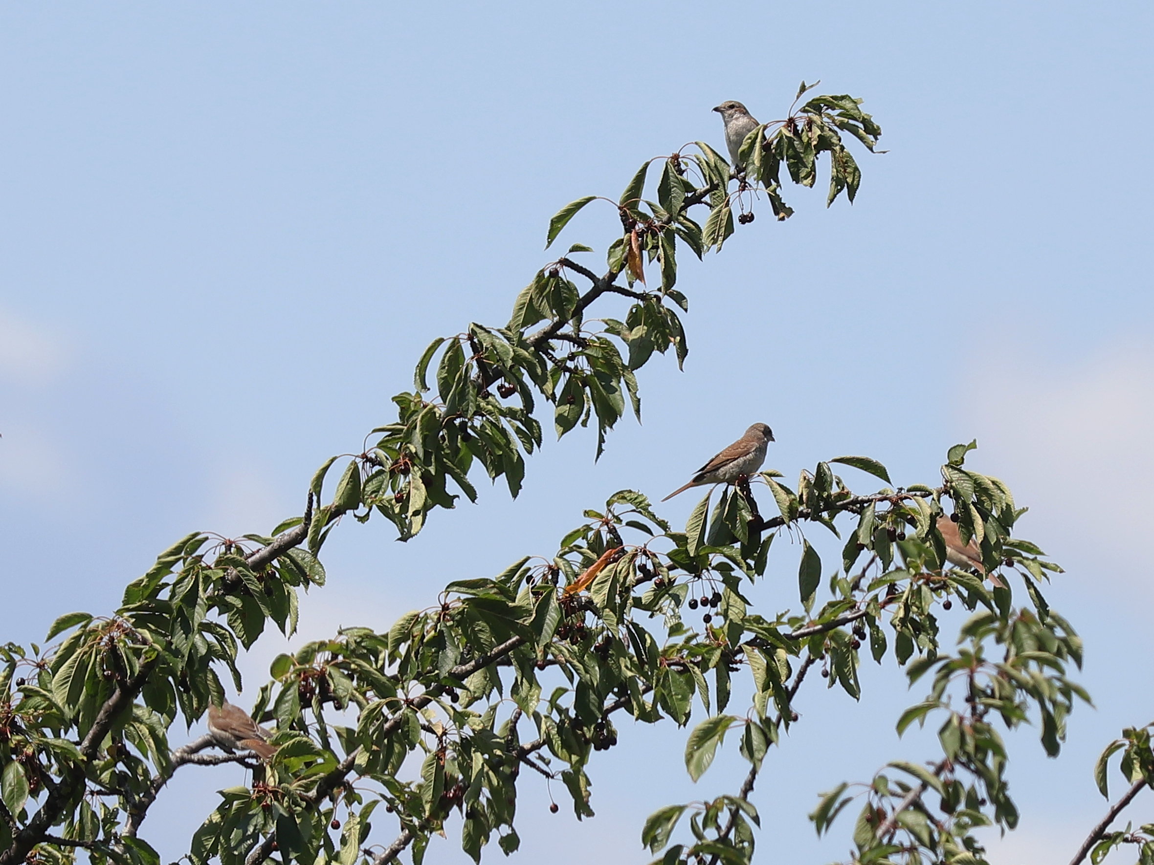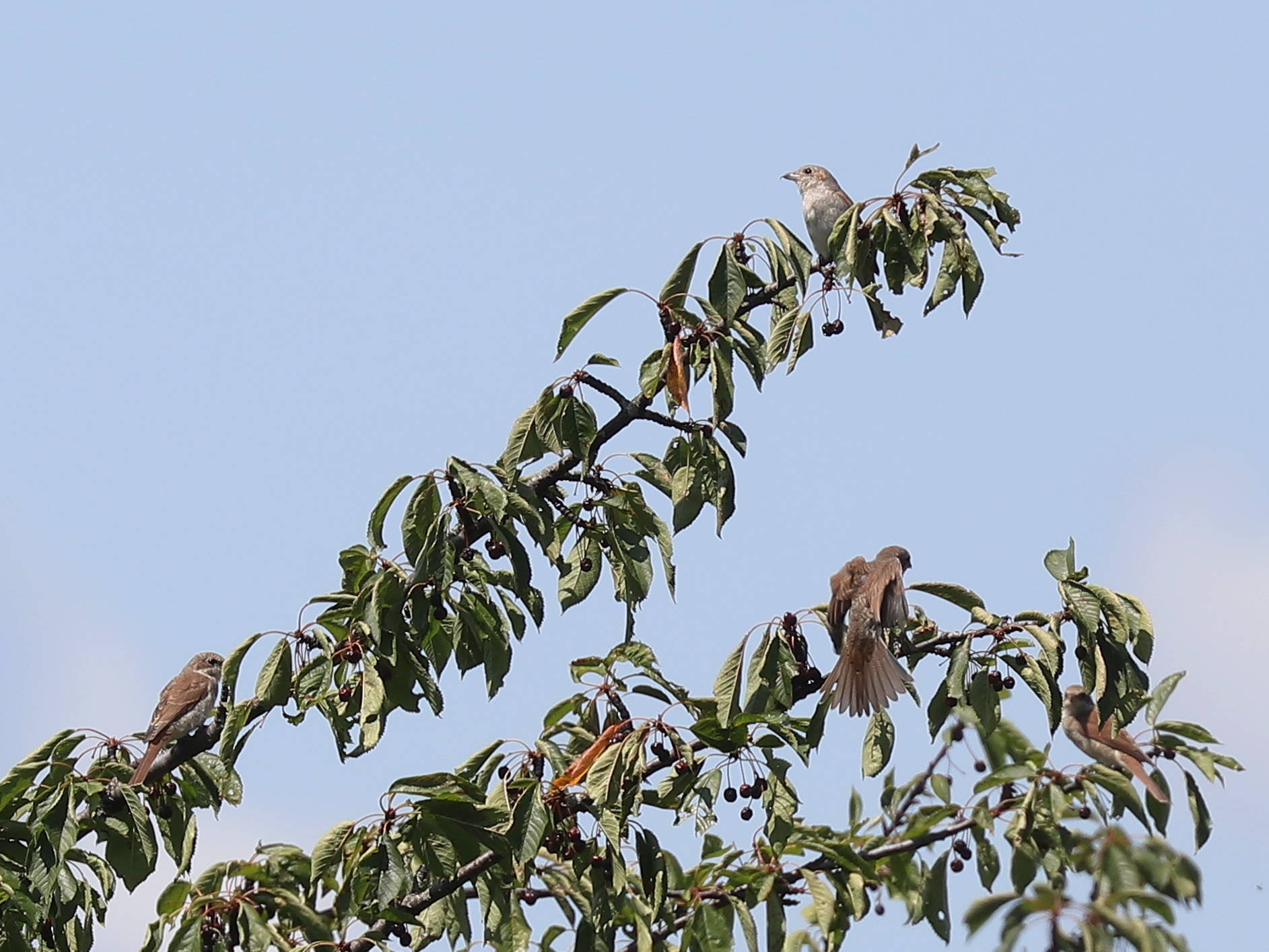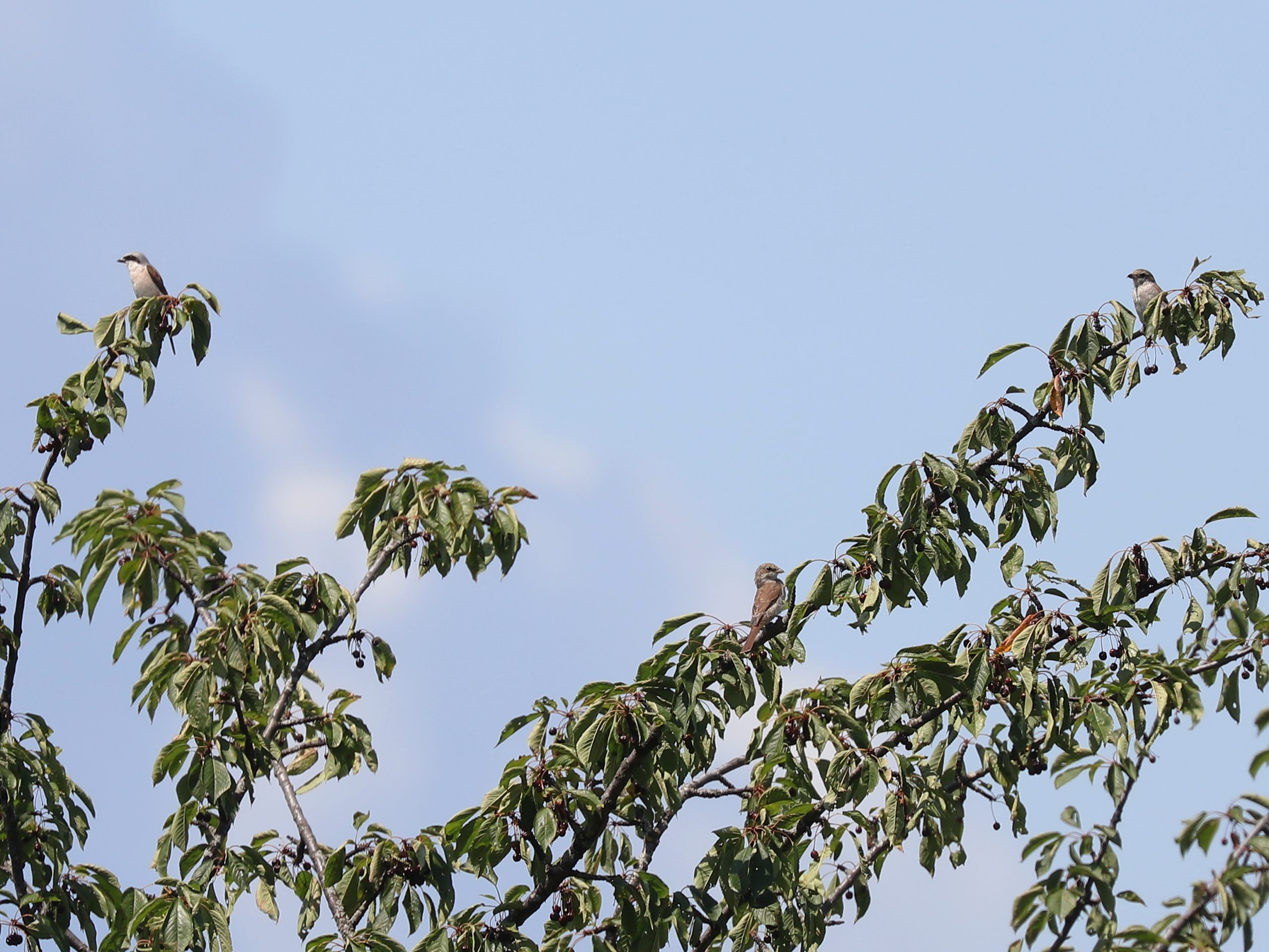 Les Pie-grièches écorcheurs Lanius collurio sont devenues plus visibles depuis quelques jours, les jeunes sont sortis des nids, capables de voler. En observant bien les branches de cerisier, on voit qu’il y a jusque 4 oiseaux, probablement une femelle et trois jeunes.
