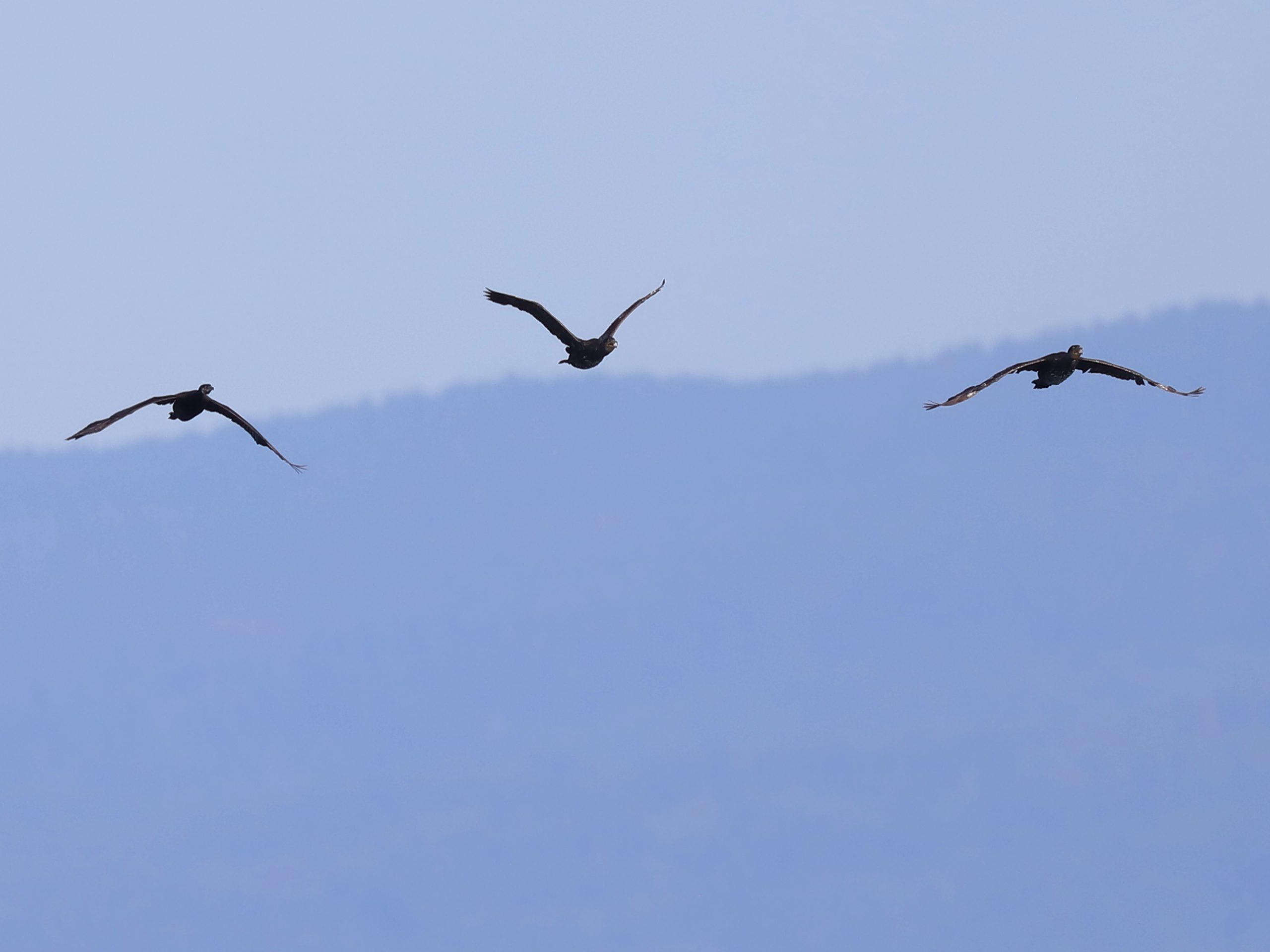Lorsqu’un vol de Grands cormorans Phalacrocorax carbo approche, c’est assez impressionnant.C’est noir, c’est grand et ça ne vole pas très haut, on peut craindre le choc – qui n’arrivera jamais. En dernière image, l’arbre qui produit du duvet cotonneux est le Saule marsault Salix caprea.