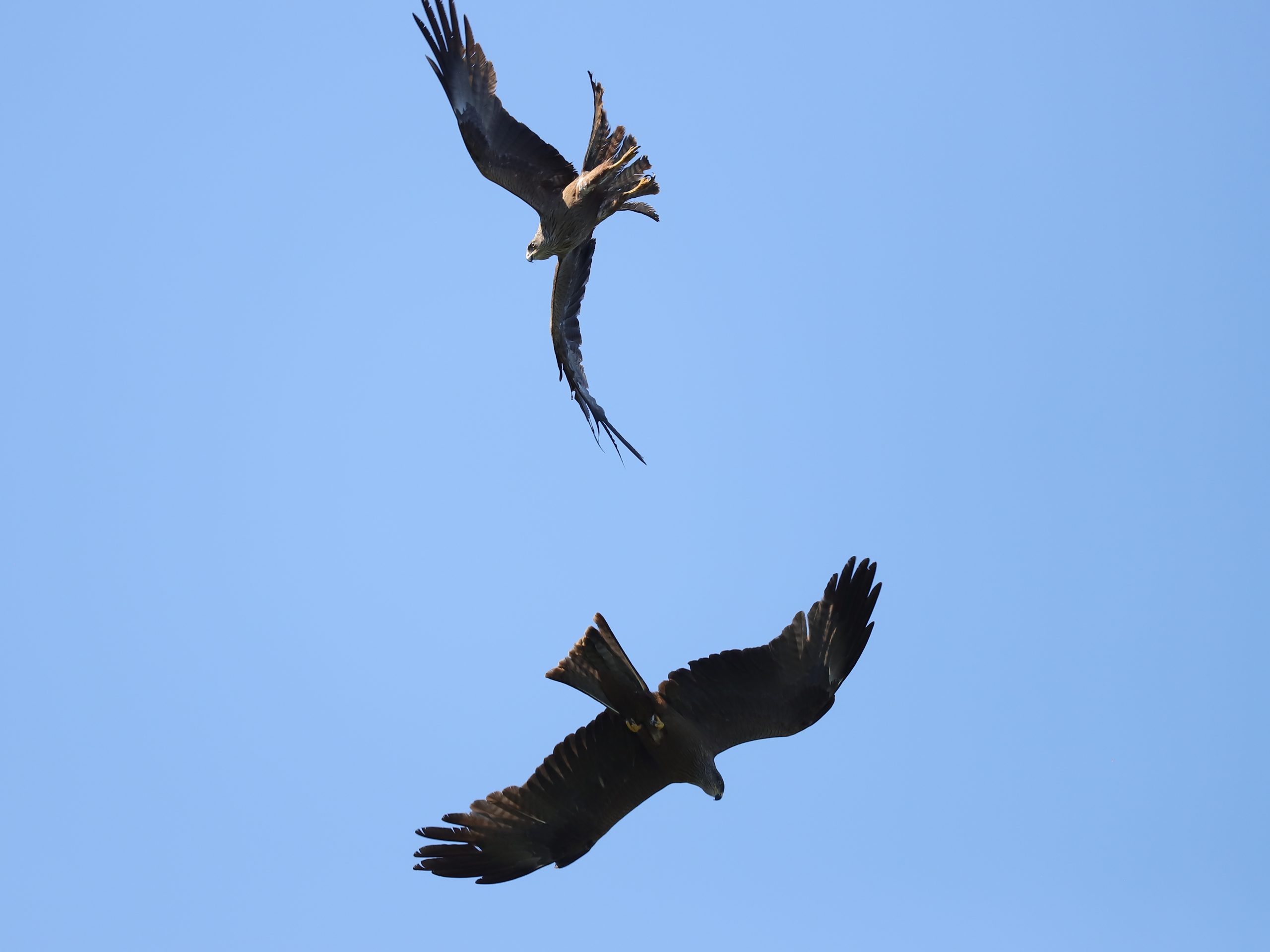 Pour en terminer avec les Milans noirs Milvus migrans de la semaine, voici des observations plus ou moins proches. Les vols en tandem peuvent être ceux de couples, certaines femelles ayant terminé leur couvée.