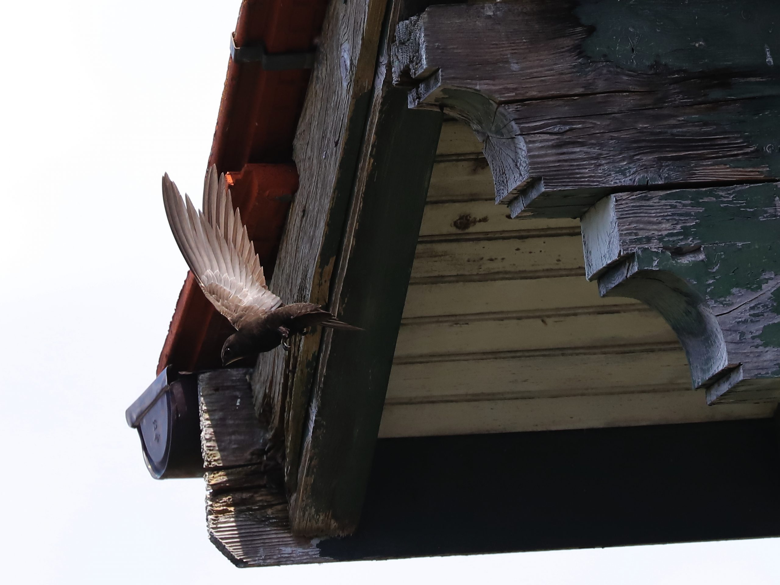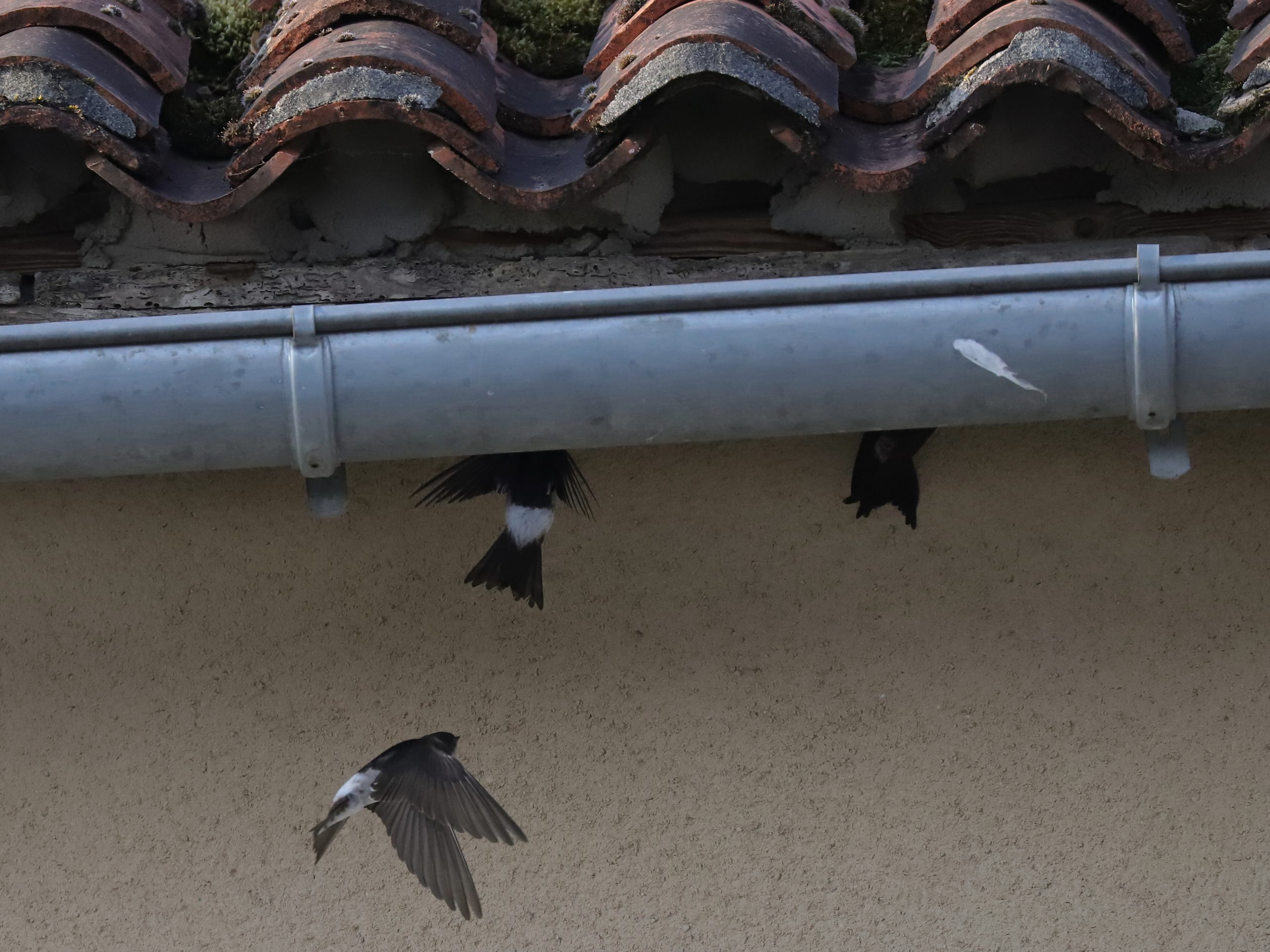 Un mystère à élucider : que viennent faire ces Martinets noirs Apus apus sous l’avant-toit d’une maison ? J’avais déjà vu ce manège l’an dernier. Les martinets ne semblent pas nicher là mais viennent souvent frôler les poutres. Y a-t’il des insectes ?