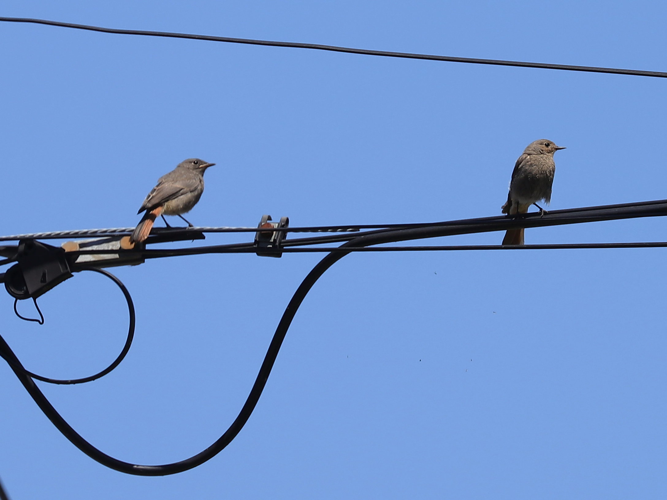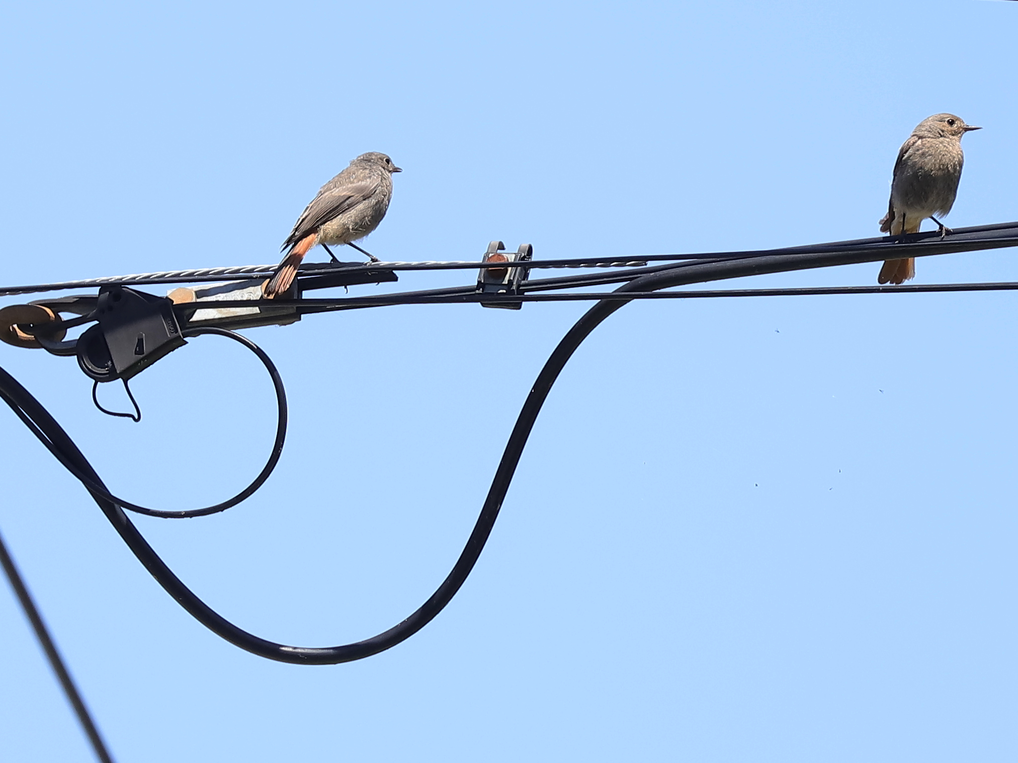 … une paire de Bouvreuils pivoine Pyrrhula pyrrhula, rarement visibles perchés sur un câble car ce sont des oiseaux vivant plutôt dans les bois …
