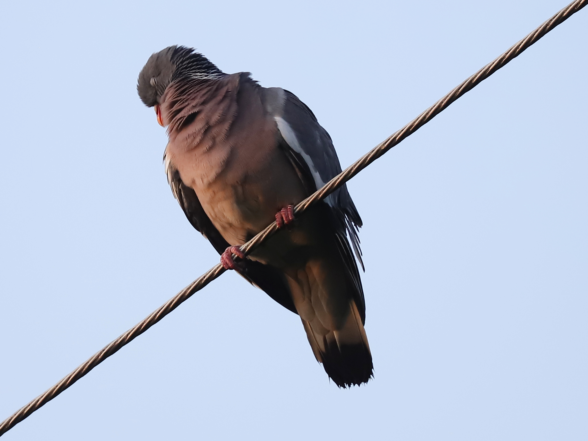 Les Pigeons ramiers Columba palumbus me semblent profiter de la baisse du nombre de rapaces dans le ciel pour se percher en toute quiétude. Une particularité de ces oiseaux est leur pupille, pas ronde et pas centrée dans l’oeil.