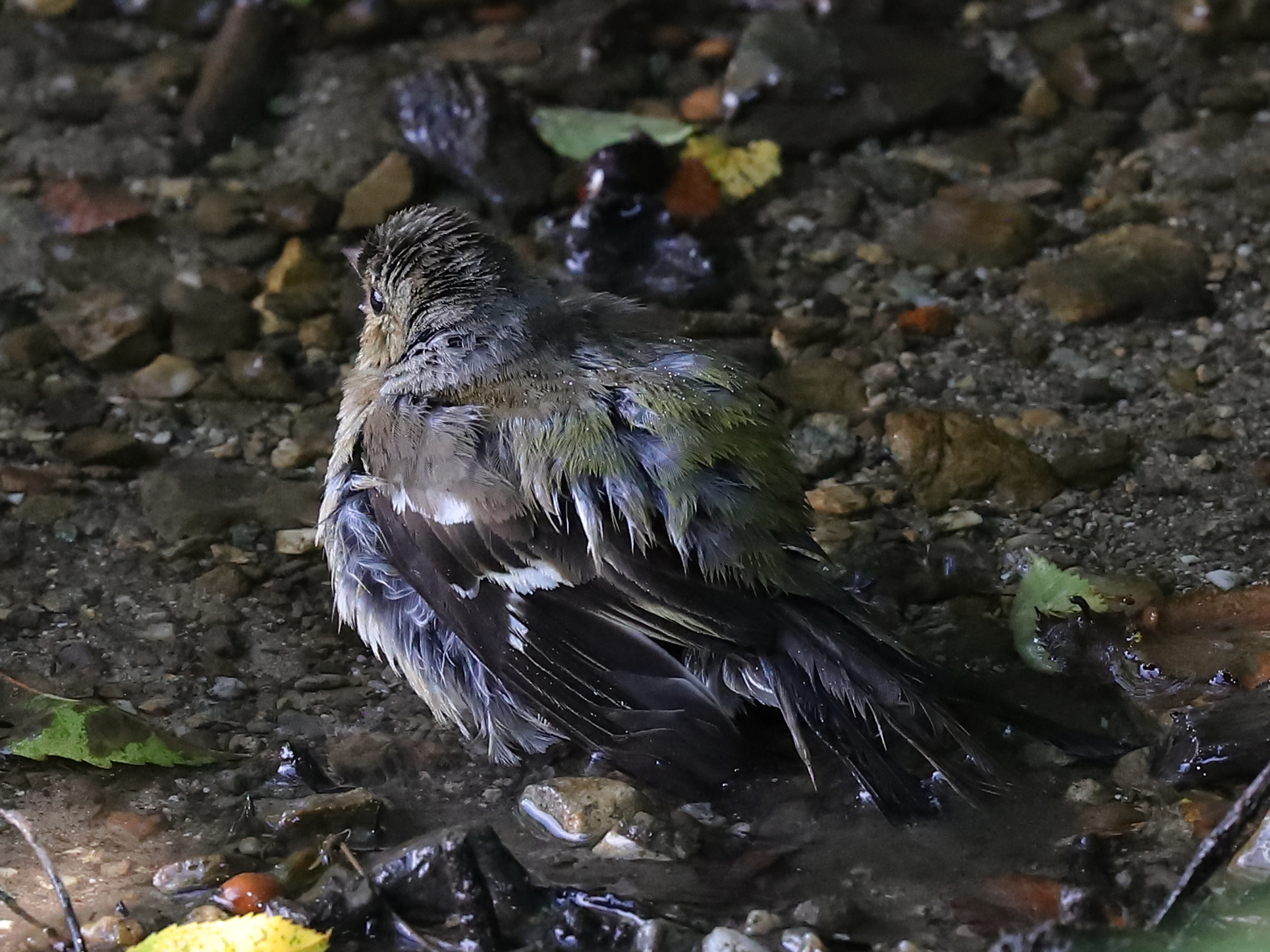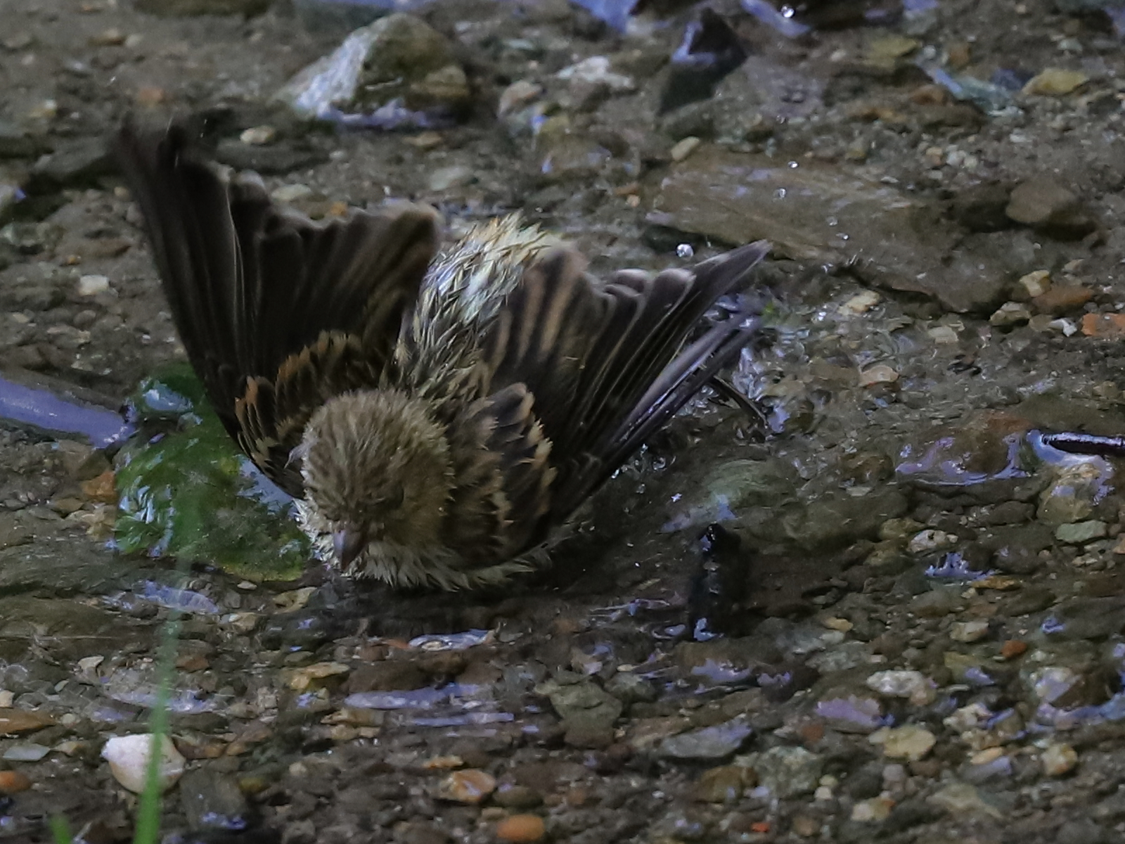 … un oiseau impossible à identifier pendant son bain, qui s’avère être une femelle de Fauvette à tête noire Sylvia atricapilla