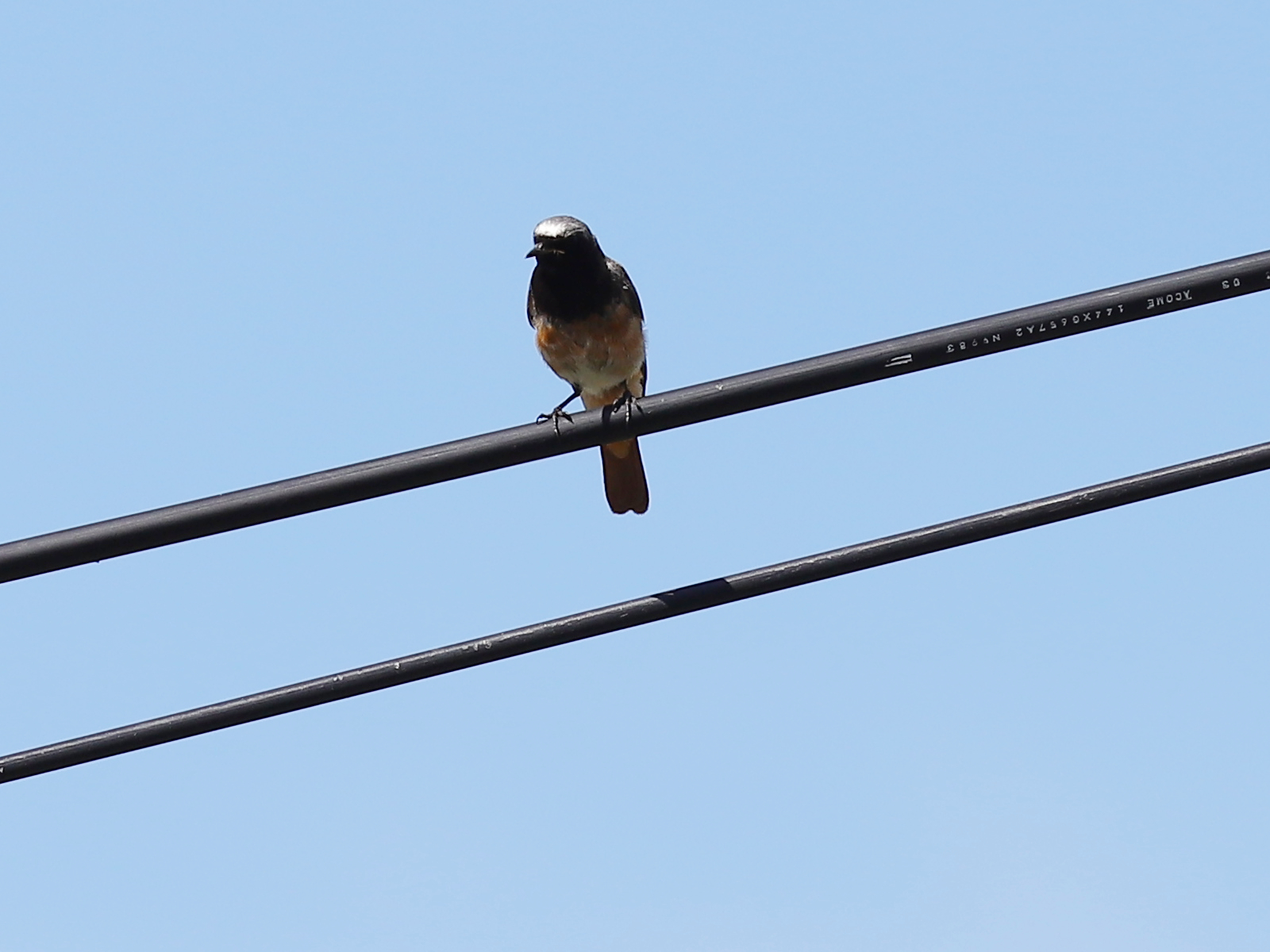 Pour qui ce mâle de Rougequeue à front blanc Phoenicurus phoenicurus attrape-t-il un papillon ? Pour son jeune affamé bien sûr . Ensuite, un peu de repos sur un fil avant de repartir en chasse.