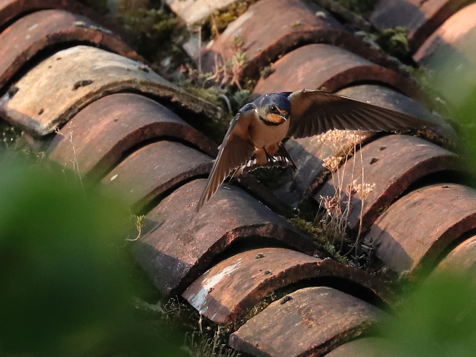 Vous avez reconnu bien sûr les oiseaux au-dessus, des Hirondelles rustiques Hirundo rustica. Tout un groupe de celles-ci est venu sur un toit puis sous la goutière pour, apparemment, capturer des insectes.
