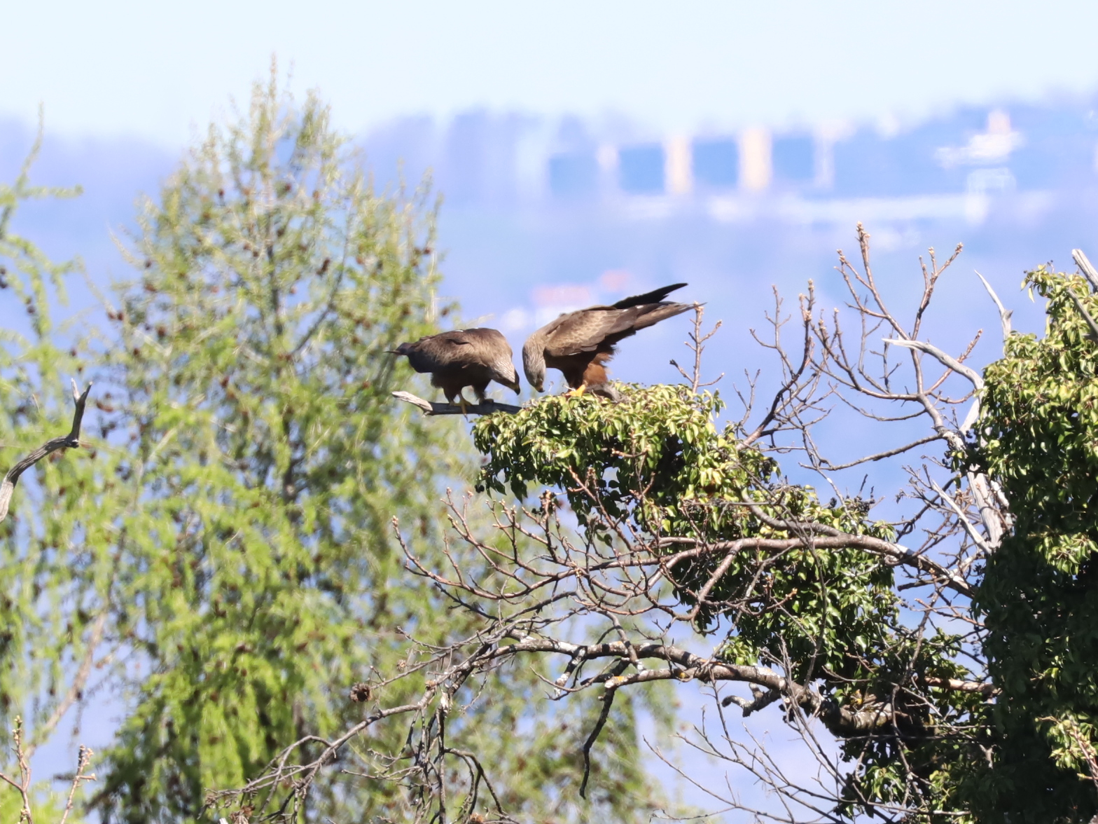 Nous vivons les semaines de consolidation ou de création des couples de Milans noirs Milvus migrans. Il y a des parades aériennes, deux oiseaux volants de manière synchronisée avant de simuler des attaques. Toutes ces photos ne sont pas du même couple, les vols sont très rapides et difficiles à suivre. Il arrive parfois qu’un troisième oiseau rejoigne le couple, peut-être dans l’espoir de créer un nouveau couple, les attaques ne sont alors pas simulées.