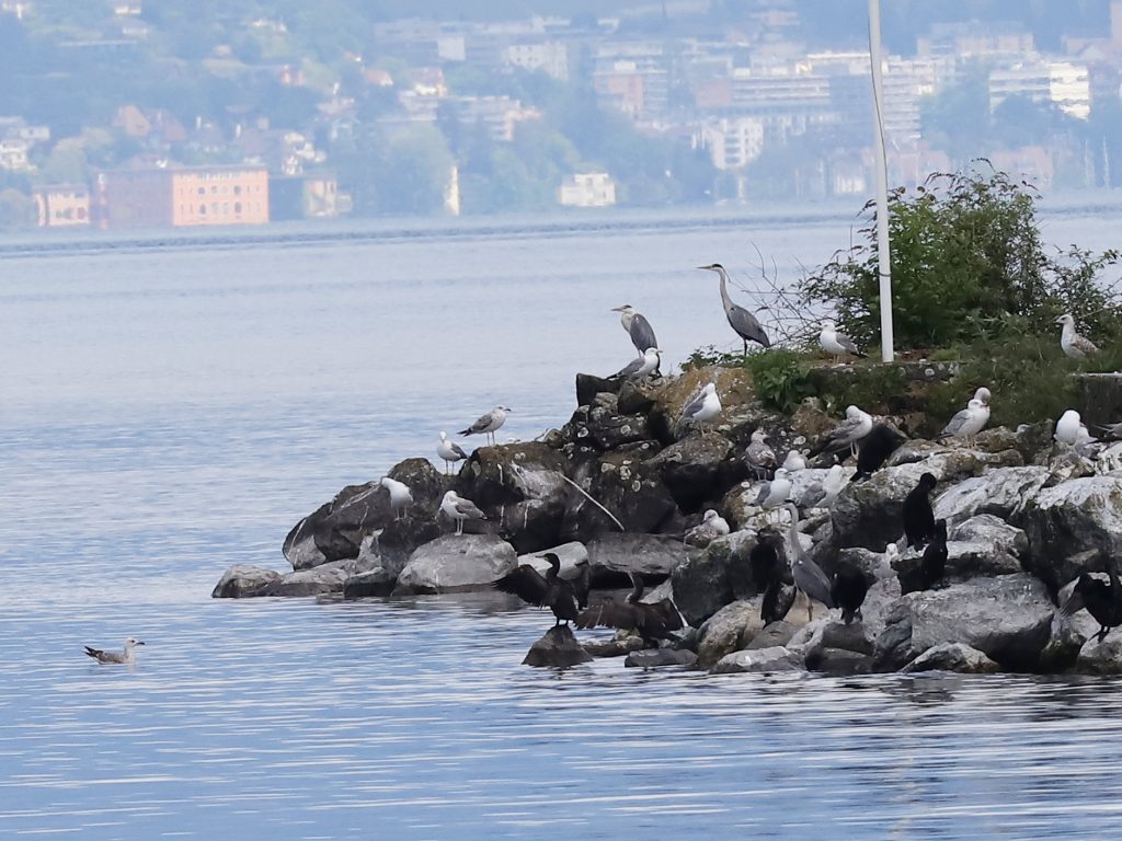 Je suis allé explorer une réserve le long du Rhône en aval de Genève, la réserve du Nant de Borbaz. On se trouve très haut sur les rives par rapport au fleuve, c’est donc peu pratique pour photographier les oiseaux comme les hérons, cormorans ou cygnes que l’on aperçoit sur cette photo même si le paysage est beau et inattendu si proche de la ville.