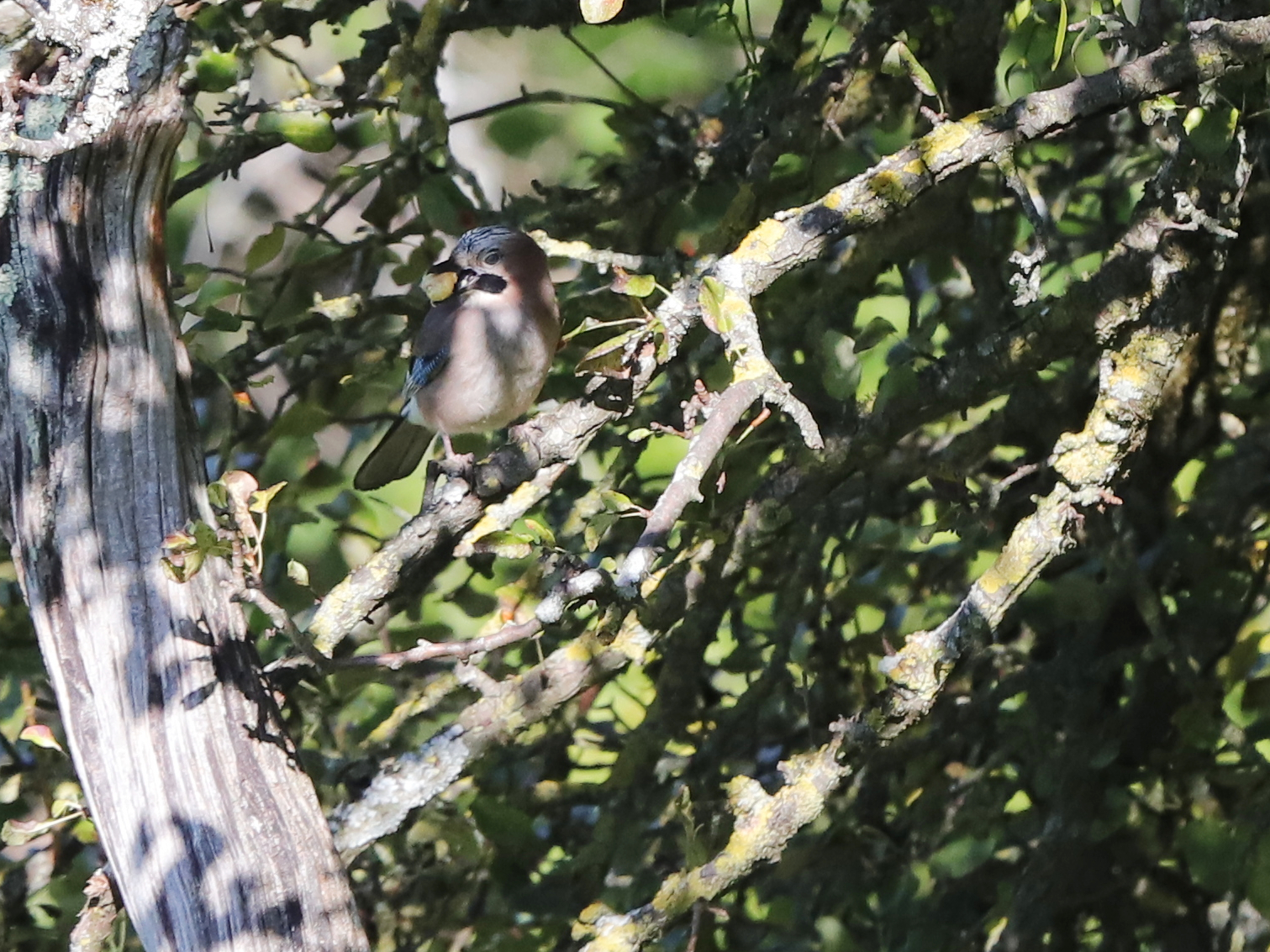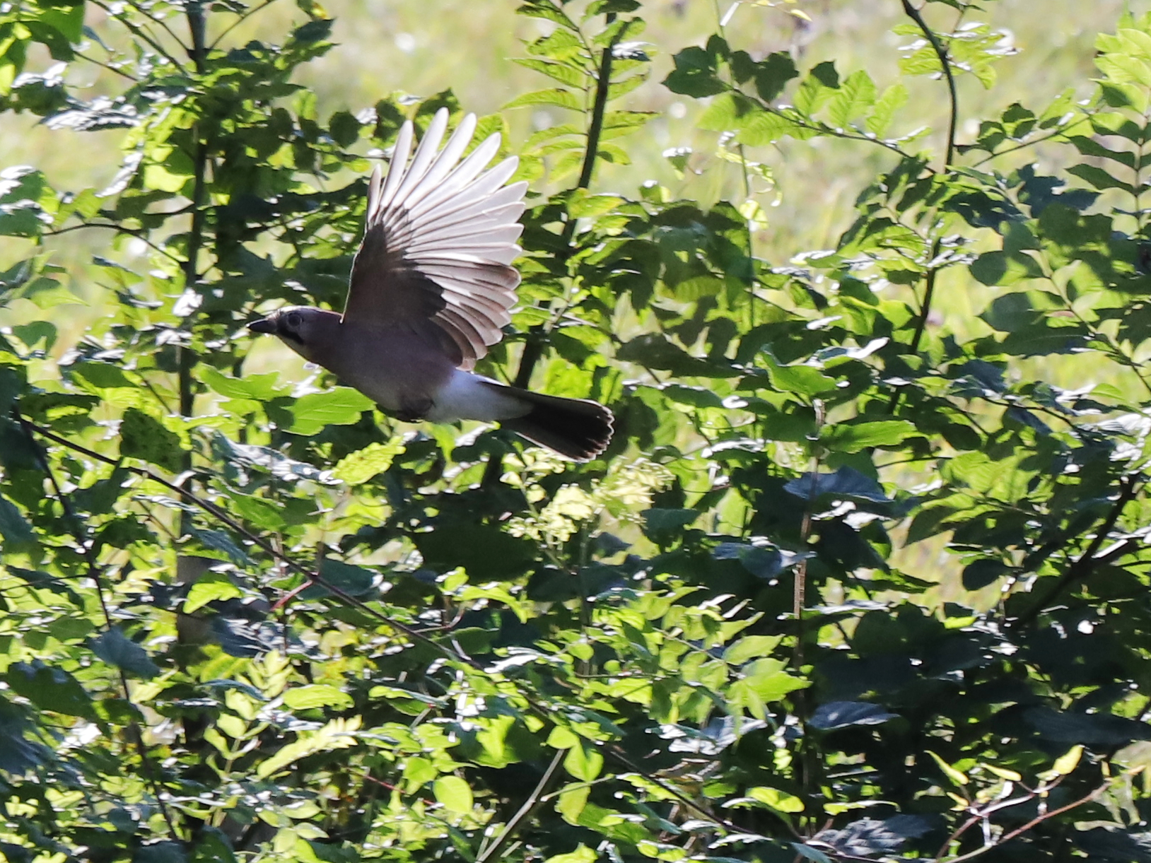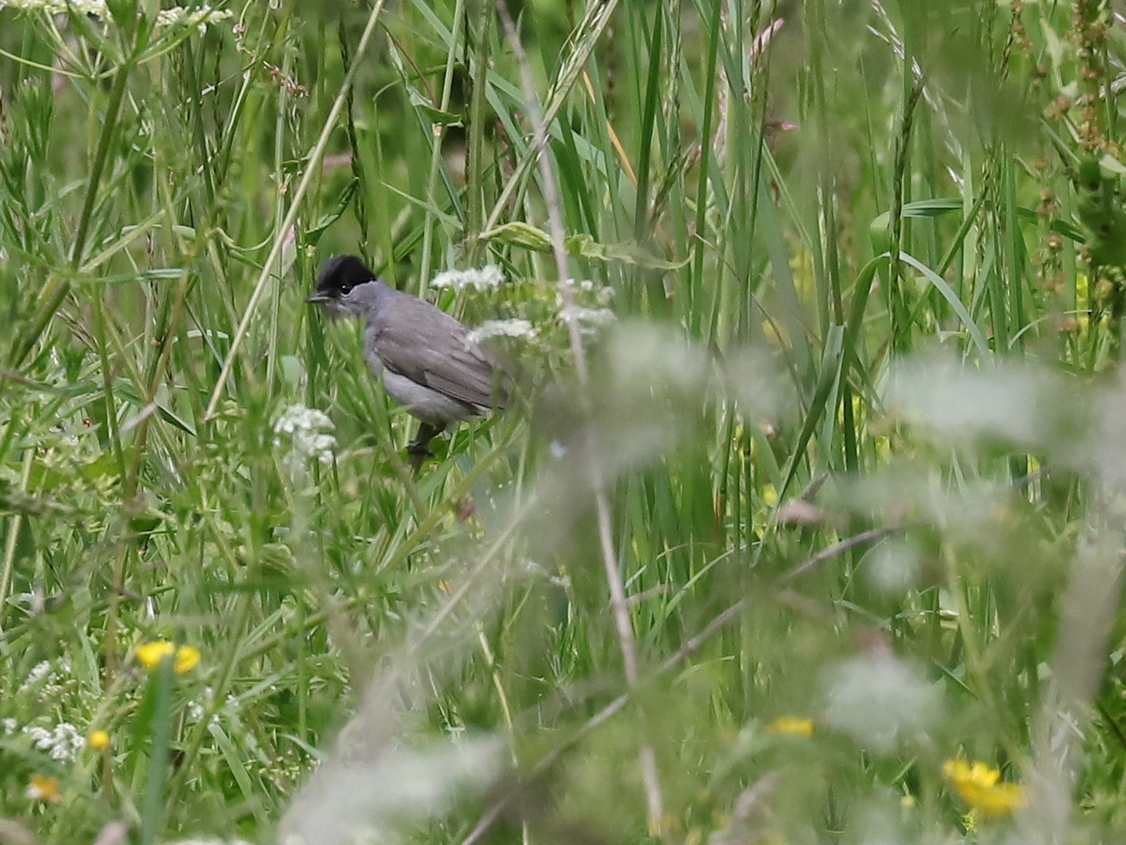 Curieusement, au milieu du ballet des Gobemouches capturant des insectes, un intrus s’était glissé discrètement, une femelle de Fauvette à tête noire Sylvia atricapilla.